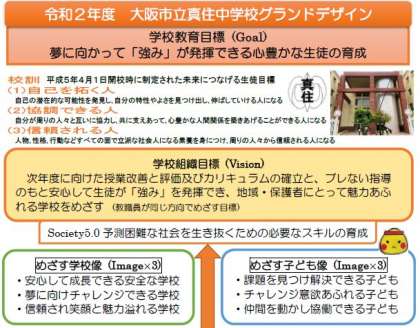 令和2年度「運営に関する計画」を4月の学校協議会により承認されたことに基づいて、「大阪市立真住中学校グランドデザイン」を作成いたしました。学校教育目標を〜夢に向かって「強み」が発揮できる心豊かな生徒の育成〜と設定し、教職員とともにチームでGoalに向かって学校経営を進めてまいります。新型コロナ対策やSociety5.0など、予測困難な社会を生き抜くための必要なスキルを身に着け、たくましく成長してほしいと思います。