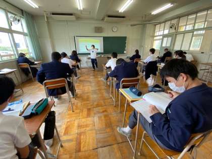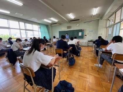 8時30 分登校のA班の授業です。国語、英語、理科の授業です。先生はフェイスシールドを使ったソーシャルディスタンスを守っています。