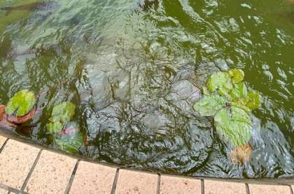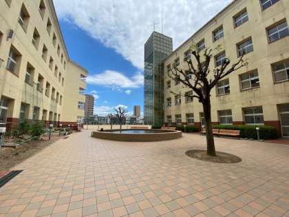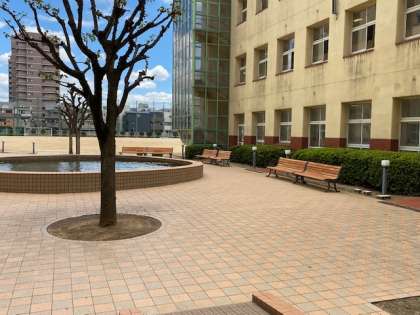 快晴の空の下に、新しくなったベンチがあって、池の鯉たちは飛び跳ねるくらい元気です。中庭のケヤキの木も管理作業員さんに散髪してもらって、やっぱり真住中学校は美しいです。