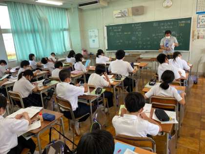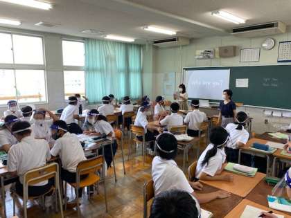英語、社会、数学の授業です。英語はフェイスシールドをつけてのグループ学習をしていました。楽しそうです。