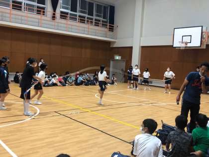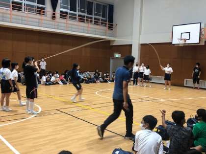 長縄とび大会の練習の様子です。クラスによってかけ声のかけ方もさまざまで、1年先生方のデモンストレーションもありました。頑張ってください!