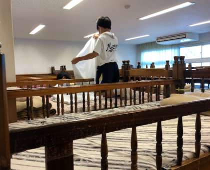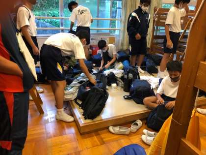 シーツの角を揃えて、きれいにたたんでいます。荷物をまとめています。