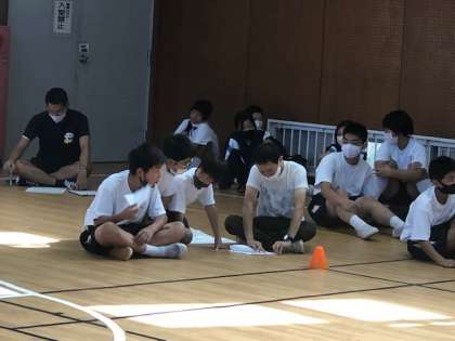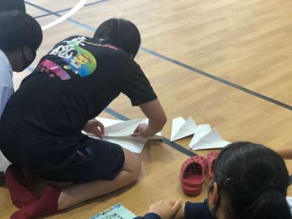 2組チーム、高記録連発で余裕です。一方、1組、4組は担任の先生の紙ひこうきの出来ばえにかかっています。梅津先生、すでに4機目です。