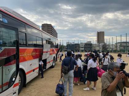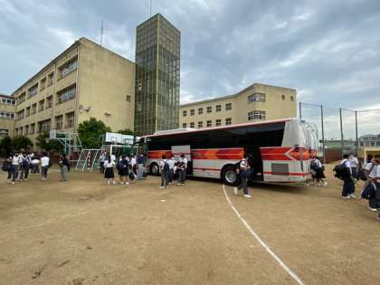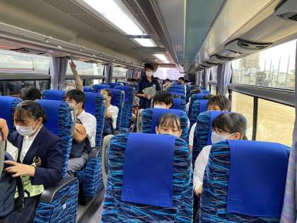 8時40分に出発しました。上部に空気循環器のついた新型バスです。飛沫感染対策をしています。マスクは必須、大声は禁止のルールでスタートしています。