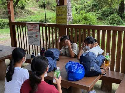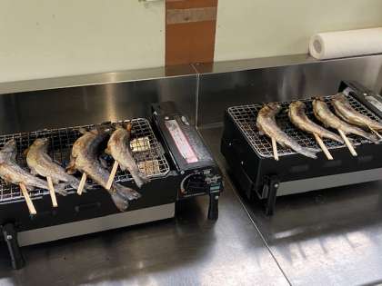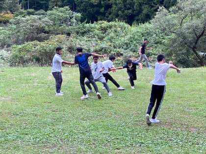 アマゴを焼いてもらってる間、芝生を走り回っています。