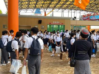 25分早くナガシマスパーランドをでました。この修学旅行は後半になるにつれて集団に協働性がうまれ、生徒一人ひとりのモチベーションが高まっています。1日目に笑顔がなかった生徒も、自信を持って笑顔で活動できるようになりました。仲間と共に暮らした3日間は彼らにとって、意義深い学習になっています。