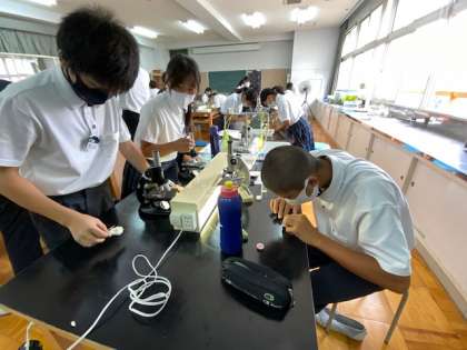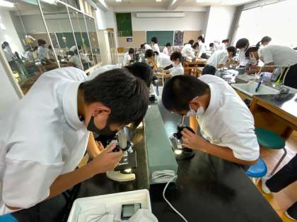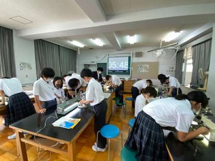いよいよ理科の実験が始まりました。顕微鏡やプレパラートの設置に集中しています。