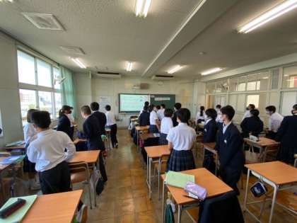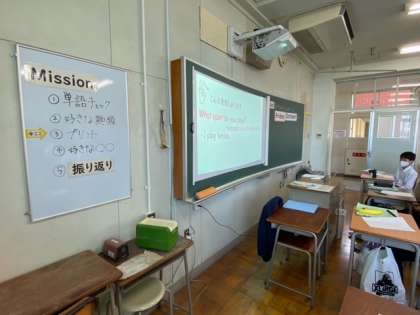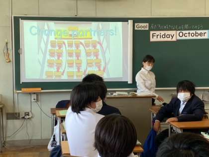 Whatの文法で、英語の会話をメインにペアで使えるようになるまで、英会話を楽しく学習しています。チェンジペアーを画面で指示しています。ご家庭で学習した復習のために英語で会話をしてみてください。