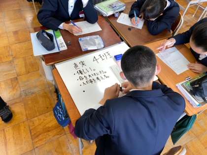 平家物語の感想から、心に残った人物について、グループで話し合い、発表するパフォーマンス課題で、特に自分の考えを文章で表現できていた生徒たちを褒めたいと思います。これからが楽しみです。