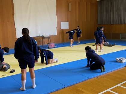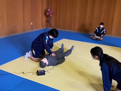 心肺蘇生法を中心とした救急救命についての学習です。なかなか力のかけ方が難しそうです。