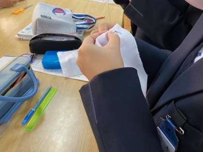 針に糸を通して、玉結びなどの作業を一緒懸命に取り組んでいます。これまでの生活の知識を使いながら楽しく授業ができました。