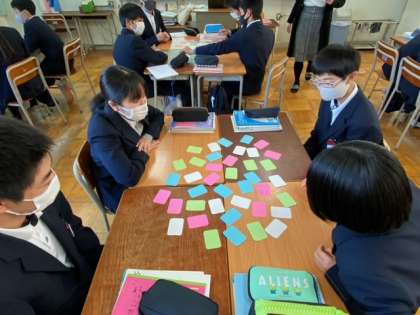 一次関数の式と表とグラフをカードにして、神経衰弱のカードゲームをしています。関数の係数や切片の意味をよく理解して、楽しくグループ学習に取り組んでいます。最後に振り返りシートにしっかり記入していいました。思考がとても働くいい授業です。