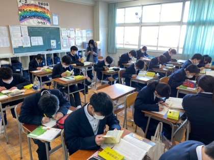 社会、数学、国語の授業です。国語は走れメロスにでる言葉の意味を辞書で調べています。
