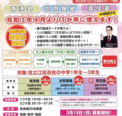 令和3年度住之江区基礎学力アップ事業として、真住塾を開講します。本日より募集が始まります。