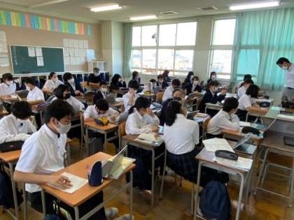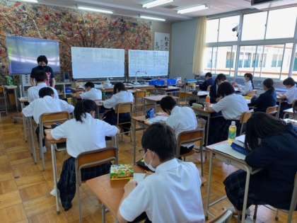 理科は一人一台端末で調べ学習、美術はお菓子の箱などのデッサン、数学は計算の工夫を相談して考えています。