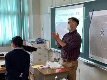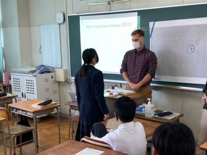 2年生の英語で、2人で早押しクイズ大会をしています。ポジティブに自信を持って発言しているところと、それに注目している仲間の拍手が、素晴らしいと感じました。
