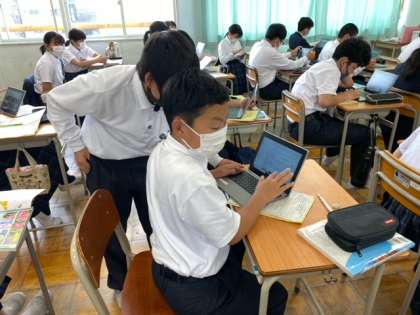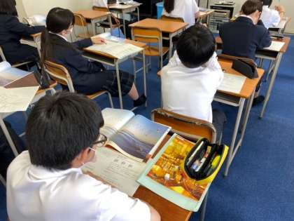 2年女子のシャトルランは手を抜かず全力て走っています。1年の理科の一人一台タブレット端末が手慣れたツールになっていて生徒たちは理解が早いです。音楽の『浜辺の歌』の歌詞を深めています。日本の浜辺のシーンが浮かんでいるようです。
