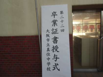 3月12日(木)、肌寒いものの絶好の日和のもと、大阪市立真住中学校第22回卒業証書授与式を行いました。卒業生の皆さん、おめでとうございます。大きな岐路をむかえ、新たなスタートをきりました。今後の飛躍に期待しています。