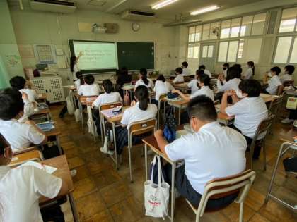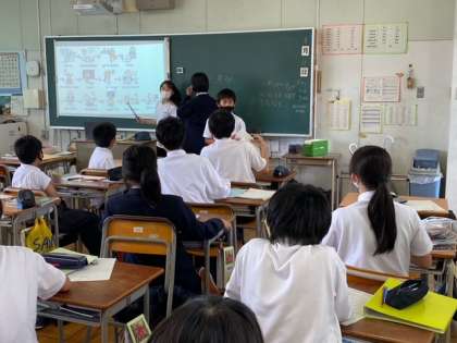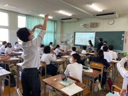 英語の授業です。友達がジェスチャーしてくれる動作を英語で答える学習です。みんなしっかり学習しています。
