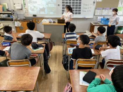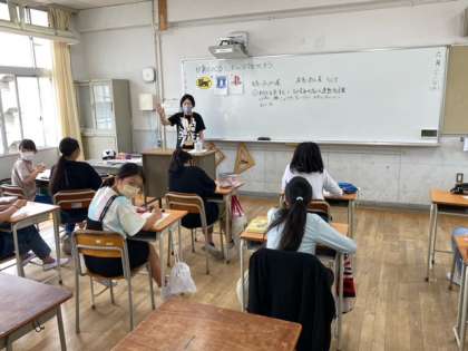 美術は自分や地域などのシンボルマークを作っています。英語はチームに分かれてtyphoon gameの英単語ゲーム、国語は短い文章から推理ゲームをしています。