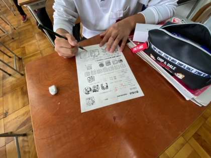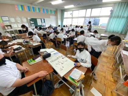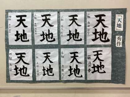 1年生の国語のグループ学習、3年生の美術ハンコデザイン、1年生国語の習字天地です。素晴らしい生徒たちです。