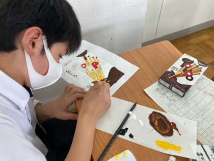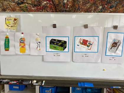 1年生の美術です。お菓子とジュースの外観をリアルに色を使って表現しています。生徒たちの集中力と表現力がとてもポジティブですね。