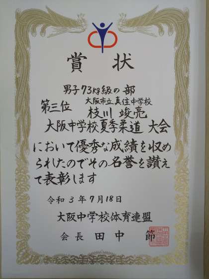 3年生の枝川竣亮さんが、大阪府で3位という成績を収めました。
