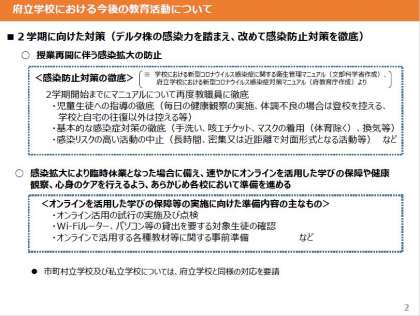 本日18日に実施されました第57回大阪府新型コロナウイルス対策本部会議の教育庁に関する資料です。これを受け大阪市教育委員会より指示がありますので、通知があり次第校内で協議をした上で皆様に改めてお知らせいたします。大阪の感染状況が拡大しご心配をおかけしておりますが、ご理解いただきますようよろしくお願いいたします。