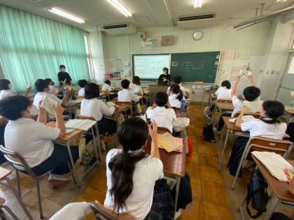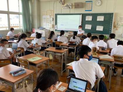 道徳のグループ学習、理科の一人一台端末での学習、英語は出された問題にまるばつで答えています。楽しく学習できています。