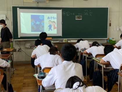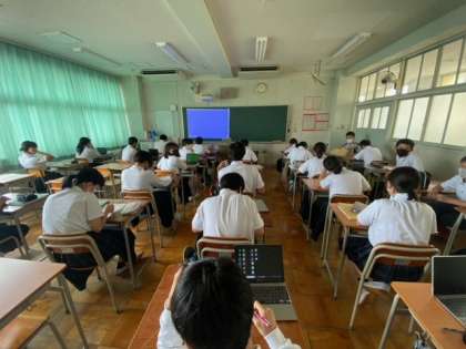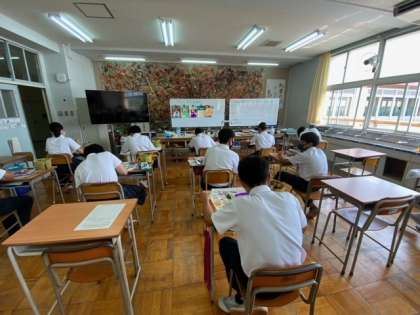 美術は絵画、英語はスライドを見て英語で解答、社会は一人一台端末で調べたことを発表しています。