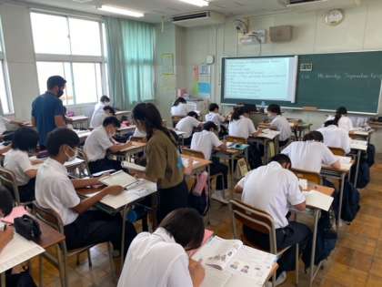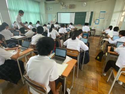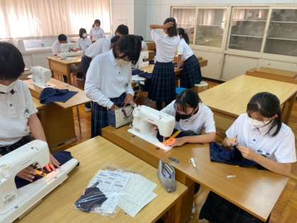 家庭はミシンの実習、理科は地すべりの災害対策、英語は会話文を読解しています。