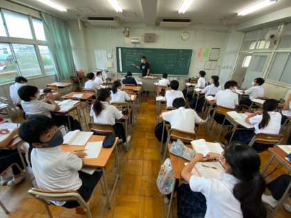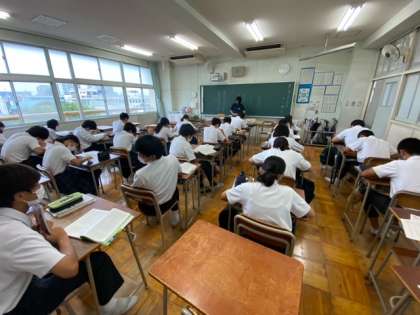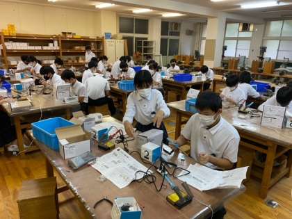 技術はハンダ付けを火傷しないように上手く作業しています。数学は一次関数の学習、国語は壁に残された伝言というタイトルの内容です。頑張っています。