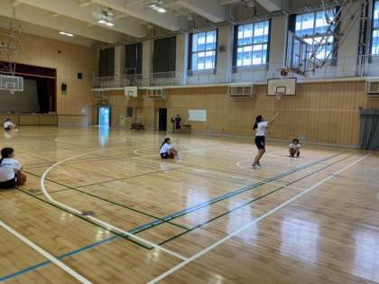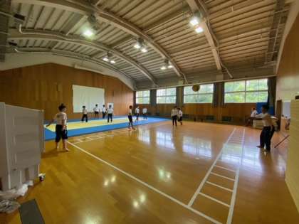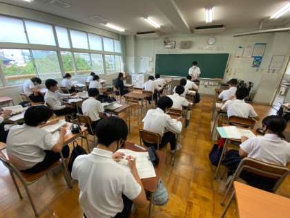 社会は評価のための振り返りシートを記入しています。体育男子はソフトドッヂボール、女子はバスケットボールです。どちらも楽しそうです。