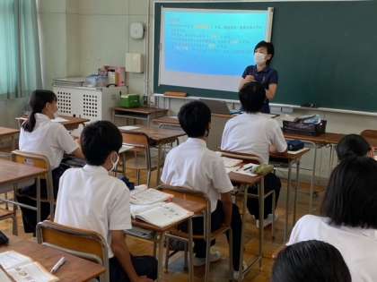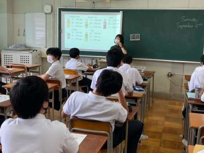 英語はペアでショップでハンバーガーなどの買い物をしています。隣の英語は、ジュースの買い物で英会話をしています。家庭科は調理を座学で学んでいます。