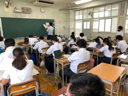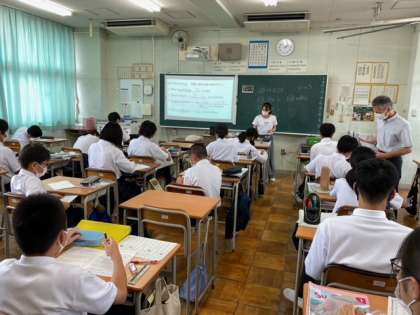 英語は代名詞の学習、理科は一人一台旅タブレットの調べ学習、数学は振り返り学習に頑張ってます。