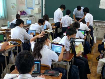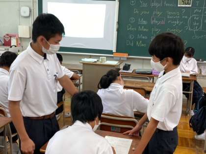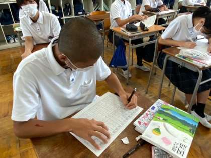 2年英語のグループ学習、国語の漢字を書く素晴らしい姿勢、1年理科のタブレットを使いこなす姿がポジティブです。