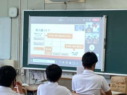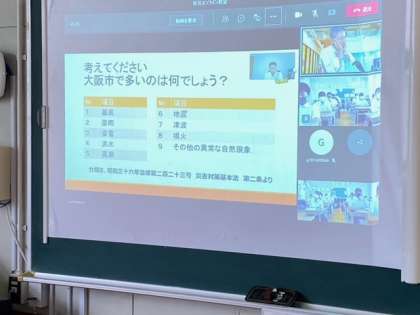 2年生の防災教育を実施しました。大阪市立大学の教授からオンラインで直接講義を受けています。