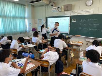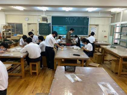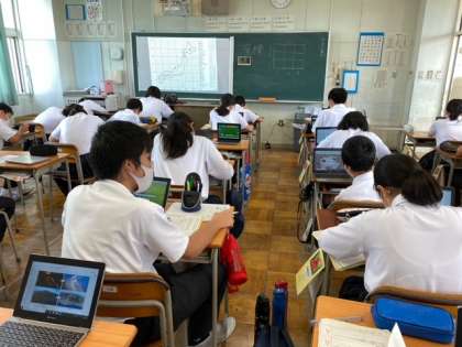 英語は3人称の学習、理科は火山の位置をタブレット端末で調べています。技術は箸をつくっています。