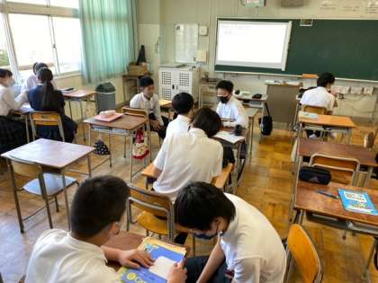 英語はペアで英会話、国語は立石寺の内容、社会は多様な社会の問題について考えています。