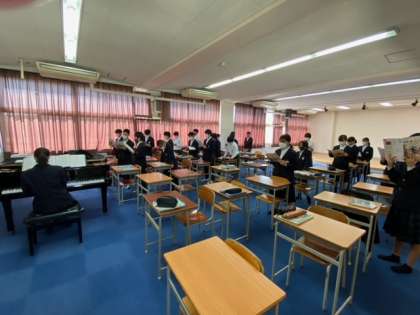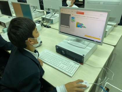 2年音楽は合唱の練習シーンです。マスクをつけたまま綺麗なハーモニーを奏でています。合唱を聴くと中学校らしいなと感じます。技術の双方向プログラミング学習はスクラッチでプログラムを作り、相手とサーバーを介してチャットをしています。素晴らしいです。