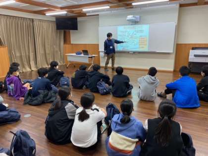ジオパークで砂丘の学習をしています。しっかり学習しています。素晴らしい。