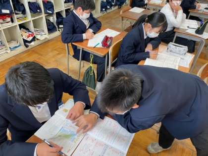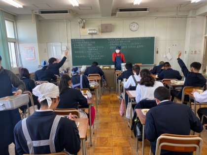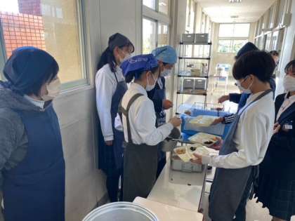 2年社会の調べ学習と2年生の給食のシーンです。手を挙げておかわりします。