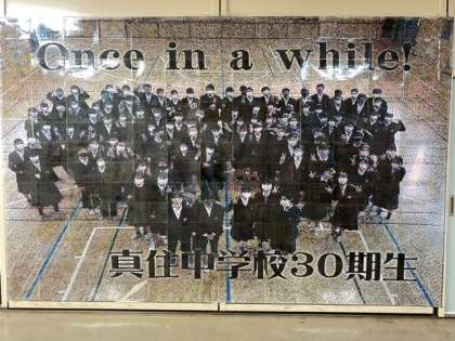 コロナ禍の総合、2年生全員で作成したモザイクアートです。Once in a while 絆を感じるポジティブな生徒たちです。