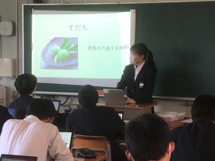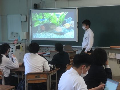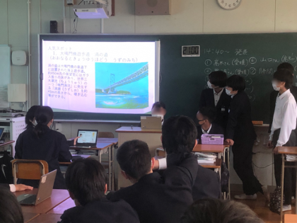 修学旅行の事前学習で調べた内容を発表しています。