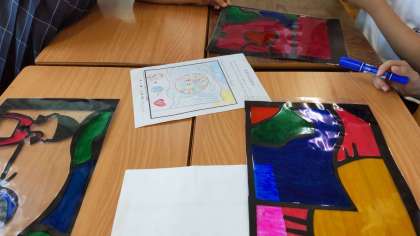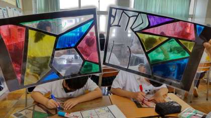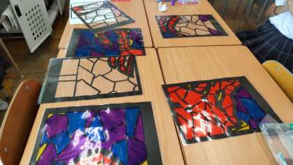 総合の時間と放課後の時間を利用して、ステンドグラスづくりを進めています。切り絵をラミネート加工し、色を塗っていきます。完成が楽しみです!!