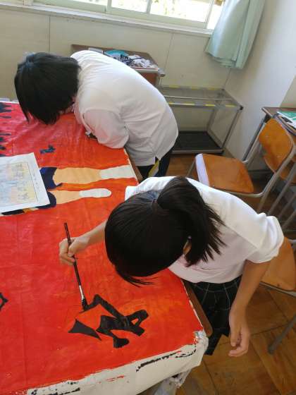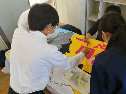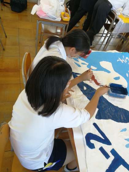1年生の学級旗作成のようすです。色が着いて、迫力が出てきました。もう少しで完成です。