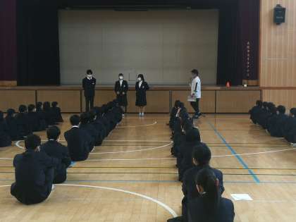 毎週水曜日の朝は、1年生の学年集会です。今日は、3月20日に行われる球技大会の抽選と、球技大会に向けての体育委員の意気込みがありました。1年生最後の学年行事となります。良い思い出になることを期待しています。