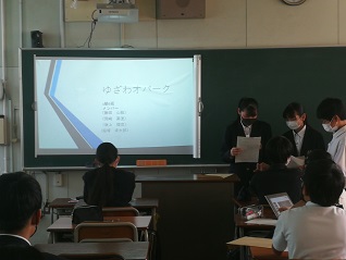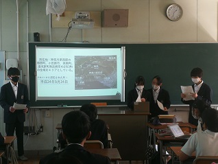 1年生は、これまで環境学習として、各地域のジオパークについて調べてきました。各班が調べたことをスライドにまとめ、発表をしました。それぞれのスライドに写真やアニメーションを組み込むなど、とても工夫されていました。