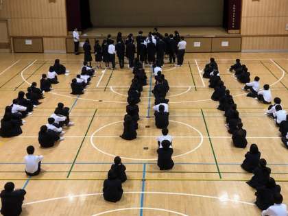 1年生学年集会で、一泊移住の各取組の表彰を行いました。