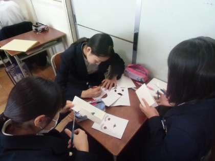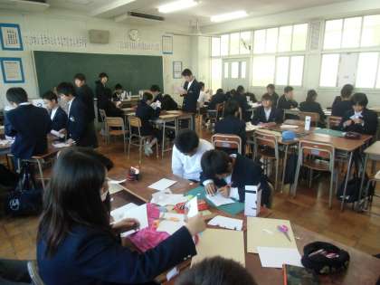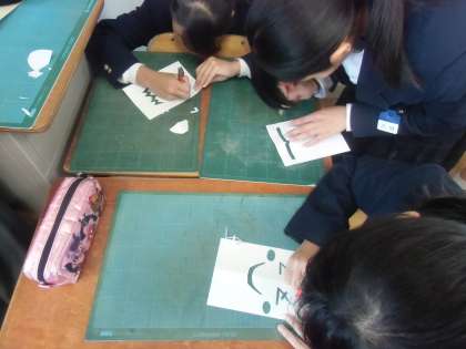 写真は、2年生の文化祭の展示作品を、各クラスで作成している様子です。白い紙を切り抜いています。どんな作品が完成するかは、本番当日のお楽しみで!!